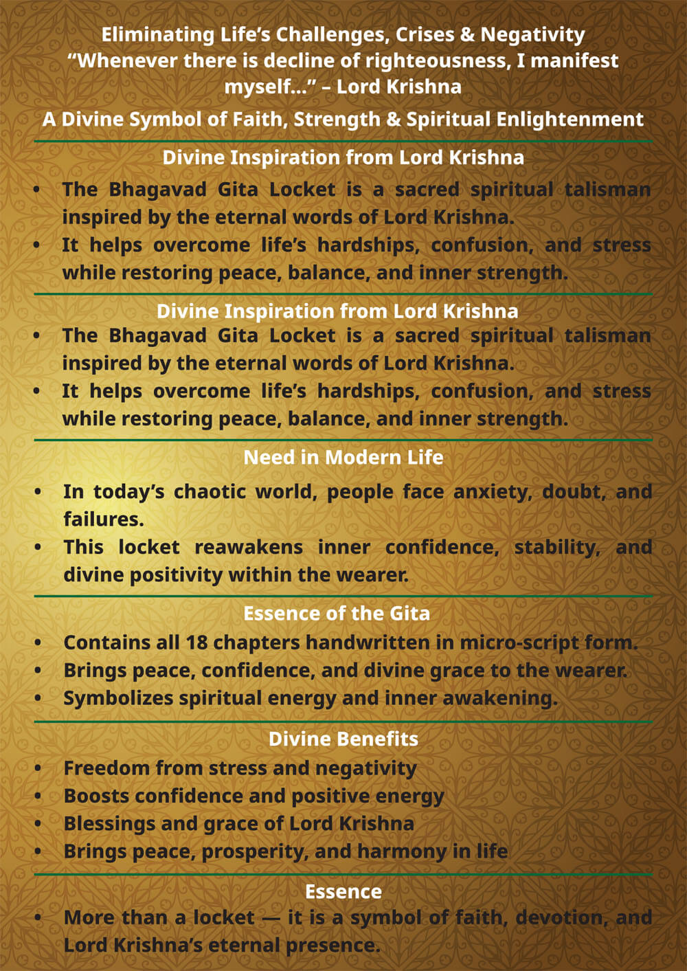The Bhagavad Gita Locket is not merely an ornament—it is a living embodiment of Lord Krishna’s wisdom, a source of strength, and a pathway to peace, prosperity, and self-realization.